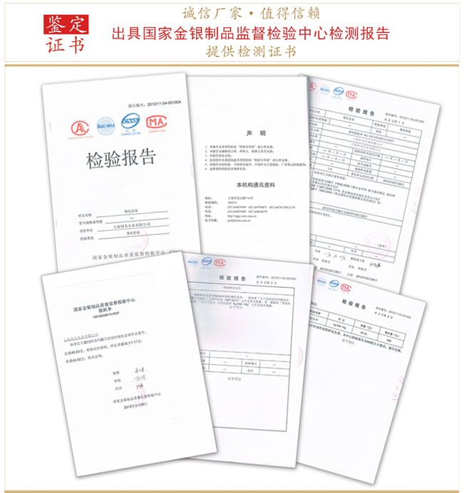 ·产品在交货前客户可任意在大货中抽选产品,由我公司工作人员共同送到金银制品监督检验(上海)进行抽检,并出具检测报告。