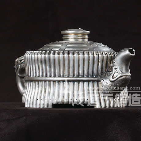 此壶俗称“龙头一捆竹”。八卦束竹壶,高7.5厘米,宽10厘米,长16厘米。此壶设计极富中国传统文化意味。器身造型以64根细竹围成,工整而光洁,意境自然,腰间束带以圆竹装饰,壶底四周由四个腹部伸出的8根竹子做足,上下一体,显得协调。壶盖微凸伏羲八卦方位图,盖钮为太极图式。壶流、壶把则饰以飞龙形象,别有生趣。