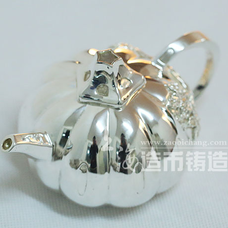 南瓜壶造型扁平,壶身作八瓣南瓜形,腹部圆鼓,向上渐收敛而成小圆口。流似卷状瓜叶,把作成随意弯扭的瓜蔓,藤蔓贴饰壶身,钮似瓜蒂,身为瓜形。整体浑然天成,自然有致。整体造型以视觉上的回顾转向来表白自然微型机的变化和造型上的整体感,趣味性与艺术性皆臻妙境。