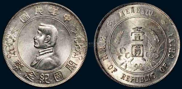 三叶→背,中间壹圆二字,而辅以嘉禾各一支,每支一穗三叶,三民主义意也(三民主义主要包括民族主义、民权主义和民生主义)。