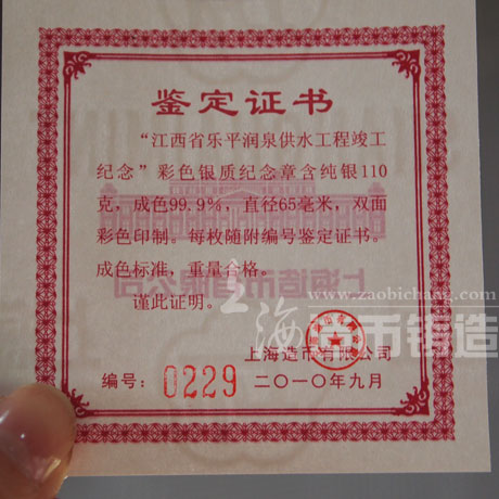 上海cmp冠军体育为了纪念这一幕就定制了江西省乐平泉水工程竣工纪念章,为纯银110g纯度99.9%,直径65mm。正面雕刻“江西省乐平润泉供水工程竣工纪念”、“2010.10”的字样,以及彩色的LOGO。背面雕刻“净水厂鸟瞰图、Ag.999 110g”的字样,以及雕刻彩色的鸟瞰图图案。采用现代造币工艺制造,工艺精湛,极具纪念和收藏价值,每枚随附防伪收藏鉴定证书。重量、成色均符合国家标准。