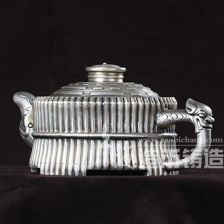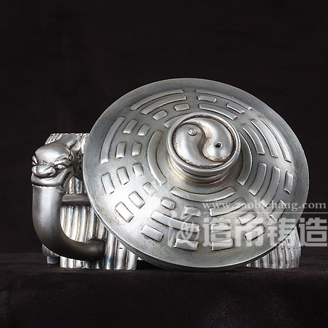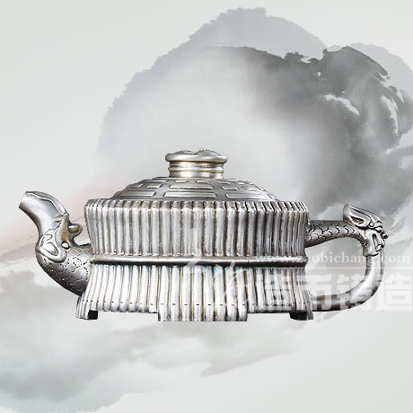 此壶俗称“龙头一捆竹”。八卦束竹壶,高7.5厘米,宽10厘米,长16厘米。此壶设计极富中国传统文化意味。器身造型以64根细竹围成,工整而光洁,意境自然,腰间束带以圆竹装饰,壶底四周由四个腹部伸出的8根竹子做足,上下一体,显得协调。壶盖微凸伏羲八卦方位图,盖钮为太极图式。壶流、壶把则饰以飞龙形象,别有生趣。