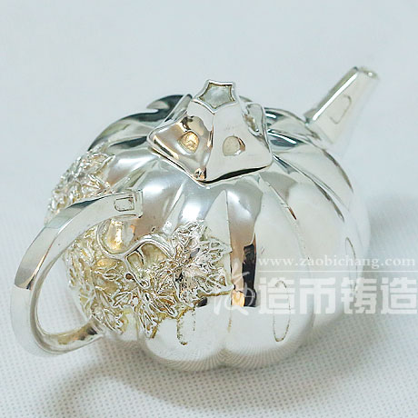 南瓜壶造型扁平,壶身作八瓣南瓜形,腹部圆鼓,向上渐收敛而成小圆口。流似卷状瓜叶,把作成随意弯扭的瓜蔓,藤蔓贴饰壶身,钮似瓜蒂,身为瓜形。整体浑然天成,自然有致。整体造型以视觉上的回顾转向来表白自然微型机的变化和造型上的整体感,趣味性与艺术性皆臻妙境。