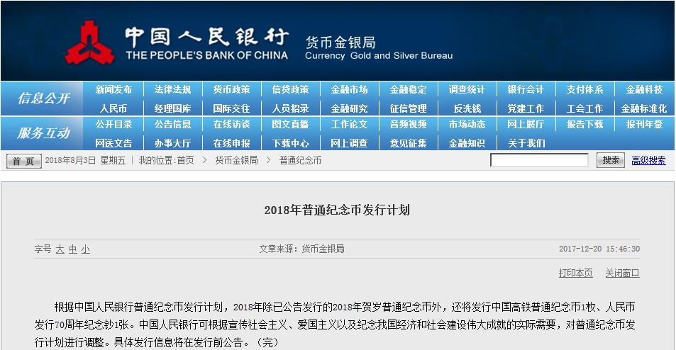 那2018年人民发行70周年的纪念币是什么时间呢?