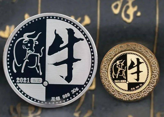 3克金章跟30银章的正面图案相同;线描牛造型与“牛”字的分区组合图案,并刊“2021”“辛丑”“足金999”字样。