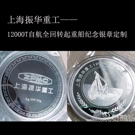 为纪念“上海振华重工12000T自航全回转起重船交船暨命名仪式”特委托“上海聚金堂专业贵金属定制中心”定制本色999银 重50克 直径50mm的定制银章,运用上海造币工艺铸造,设计大气,包装精美。