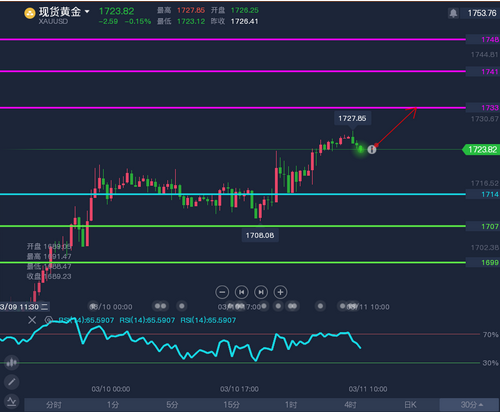 现货黄金在1714获得短线支撑,日内或朝1733-1741阻力区间运行;若失守1714恐下行至1707,甚至1699。