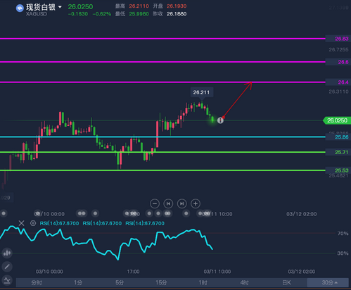 现货白银运行在转折点25.86之上,上方阻力区间在26.40-26.60;若回落至25.86之下则看空,可能下探25.71,然后是25.53。