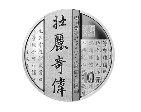 30克圆形银质纪念币背面图案为元代赵孟頫书《胆巴碑》局部文字及“壮丽奇伟”字样与“中国书法艺术”篆刻钤印等组合设计,并刊“中国书法艺术·元·赵孟頫·胆巴碑”字样及面额。