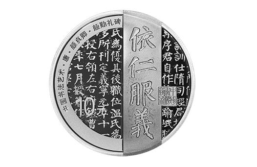 30克圆形银质纪念币背面图案为唐代颜真卿书《颜勤礼碑》局部碑文及“依仁服义”字样与“中国书法艺术”篆刻钤印等组合设计,并刊“中国书法艺术·唐·颜真卿·颜勤礼碑”字样及面额。
